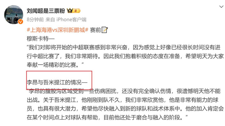 根据媒体报道,穆斯卡特已经确认海港队长李昂因为腹股沟区域受到一些伤病困扰没有办法出场,同时压哨转会过来,颜值超高的新疆球员20岁的吾米提江也没有办法上场,目前他还处于磨合与融入的阶段。 同时锋线上的加布里埃尔,还有武磊都上不了场打比赛,相当于是让了一个车马炮给深圳新鹏城。